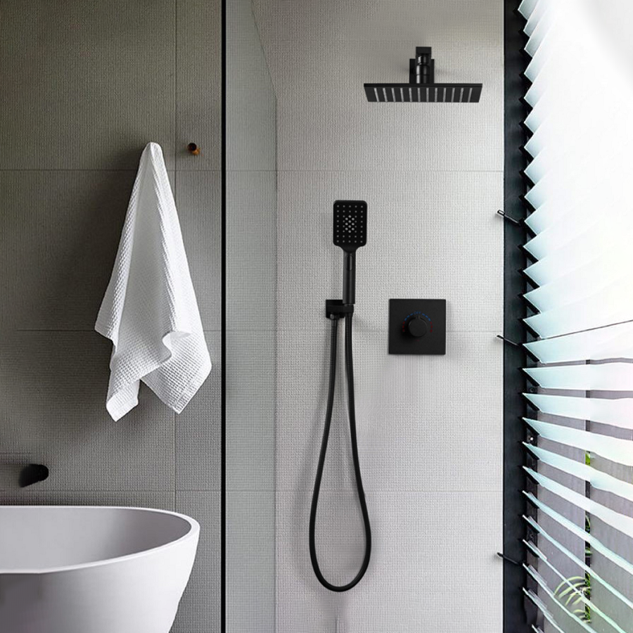Robinet mitigeur à encastrer. Équipé de 3 sorties, il permet de régler la température et d'alimenter à la fois le ciel de pluie et la douchette à main. Corps d'encastrement inclus. Dimensions : 138 x 138 mm