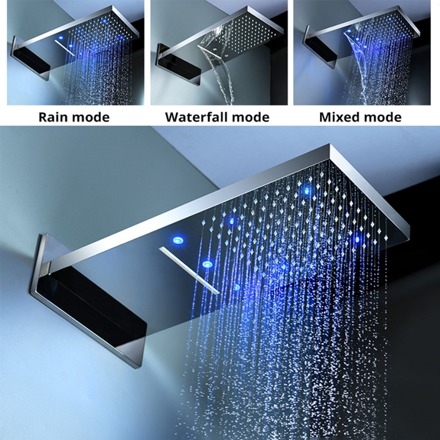 La couleur des lumières change en fonction de la plage de température à laquelle le jet d'eau de la douche sort actuellement. Lorsque la température de l'eau au-dessous de 31 °C, la couleur est le vert. Lorsque la température de l'eau au-dessous de 32 °C- 38 °C, la couleur est le bleu. Lorsque la température de l'eau au-dessous de 39°C- 45 °C, la couleur est le rouge. Éclairage à LED est activé par l'écoulement de l'eau. Pas besoin de piles.