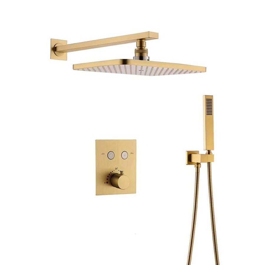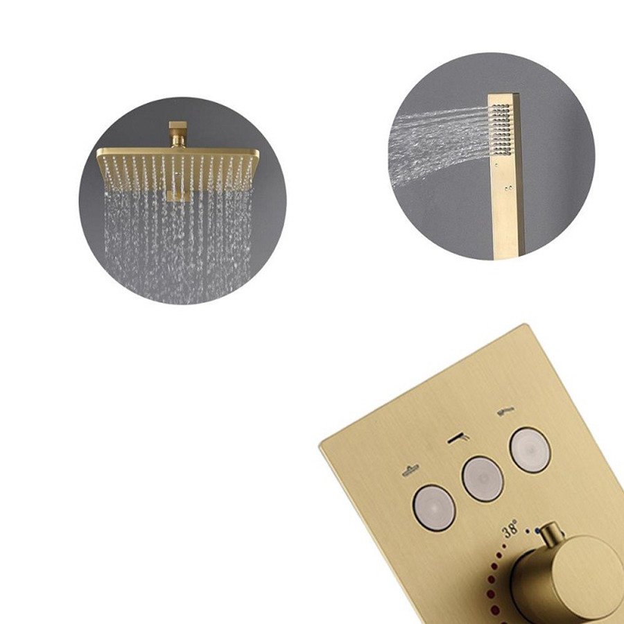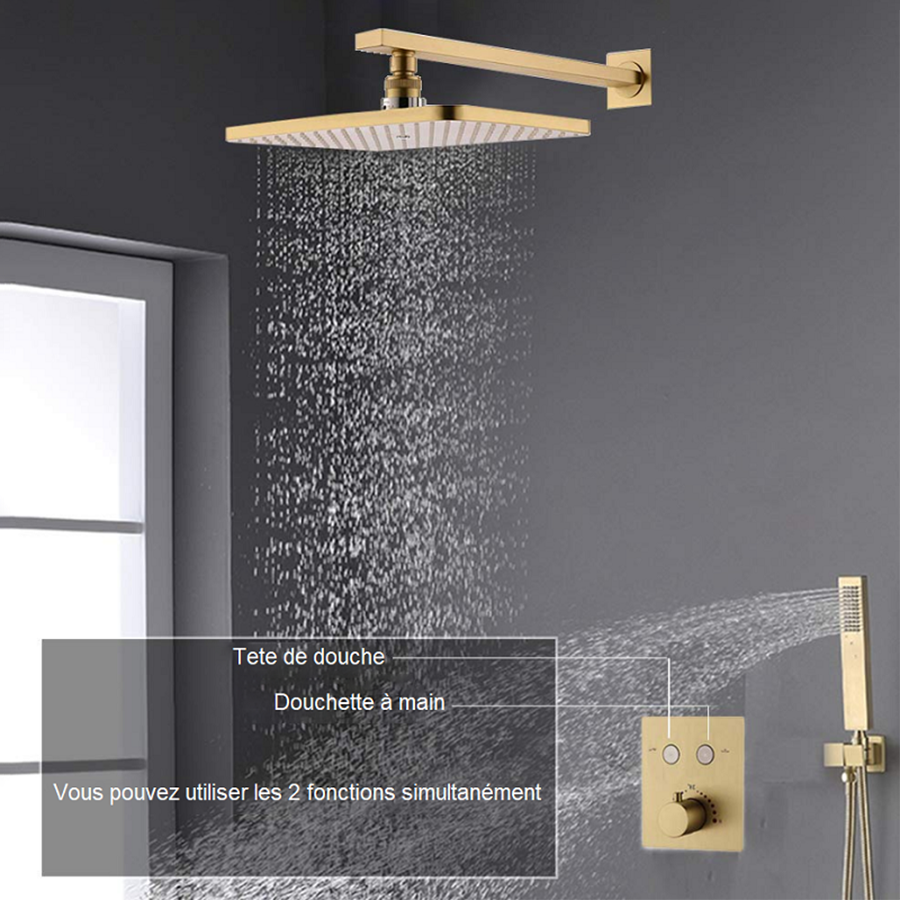Robinet mitigeur thermostatique à encastrer. Équipé de 3 sorties, il permet de régler la température et d'alimenter à la fois le ciel de pluie et la douchette à main. Corps d'encastrement inclus. Ce type de robinetterie dispose d'une butée de sécurité à 38°C afin d'éviter les brûlures. Dimensions : 170 x 150 mm